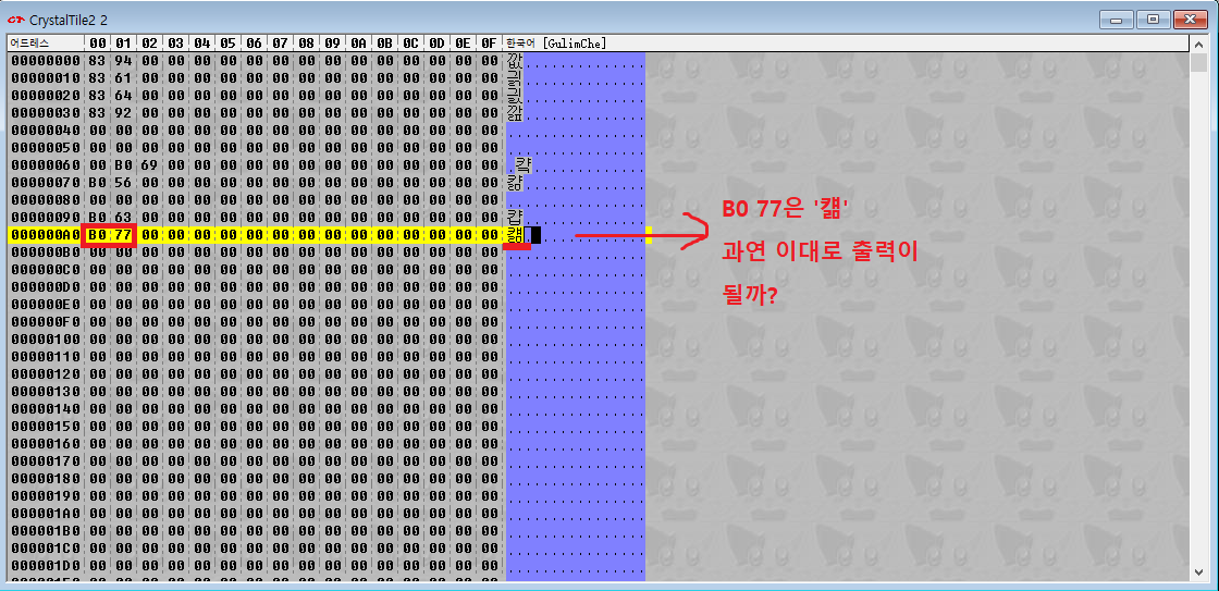 진짜로 '컒' 자가 출력된 것을 확인할 수 있었다. 아무래도 저 부분이 뒷 바이트를 담당하고 있는 모양이다.