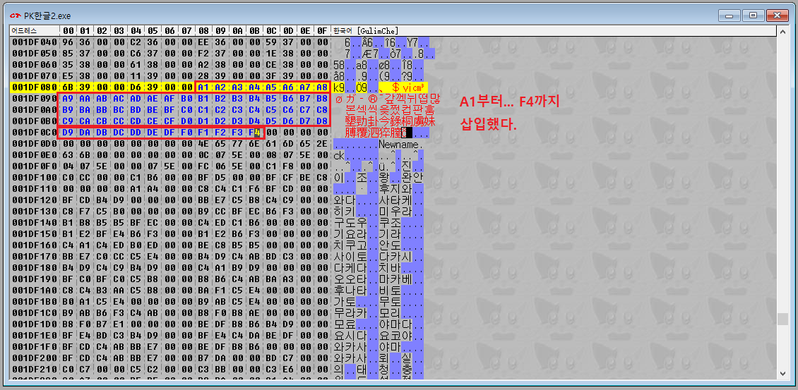 - 0x1DF088부터 0x1DF0CB : 93 41 43 45...(중략)...87 42 44를 A1 A2 A3 A4...(중략)...F2 F3 F4로 변경.
