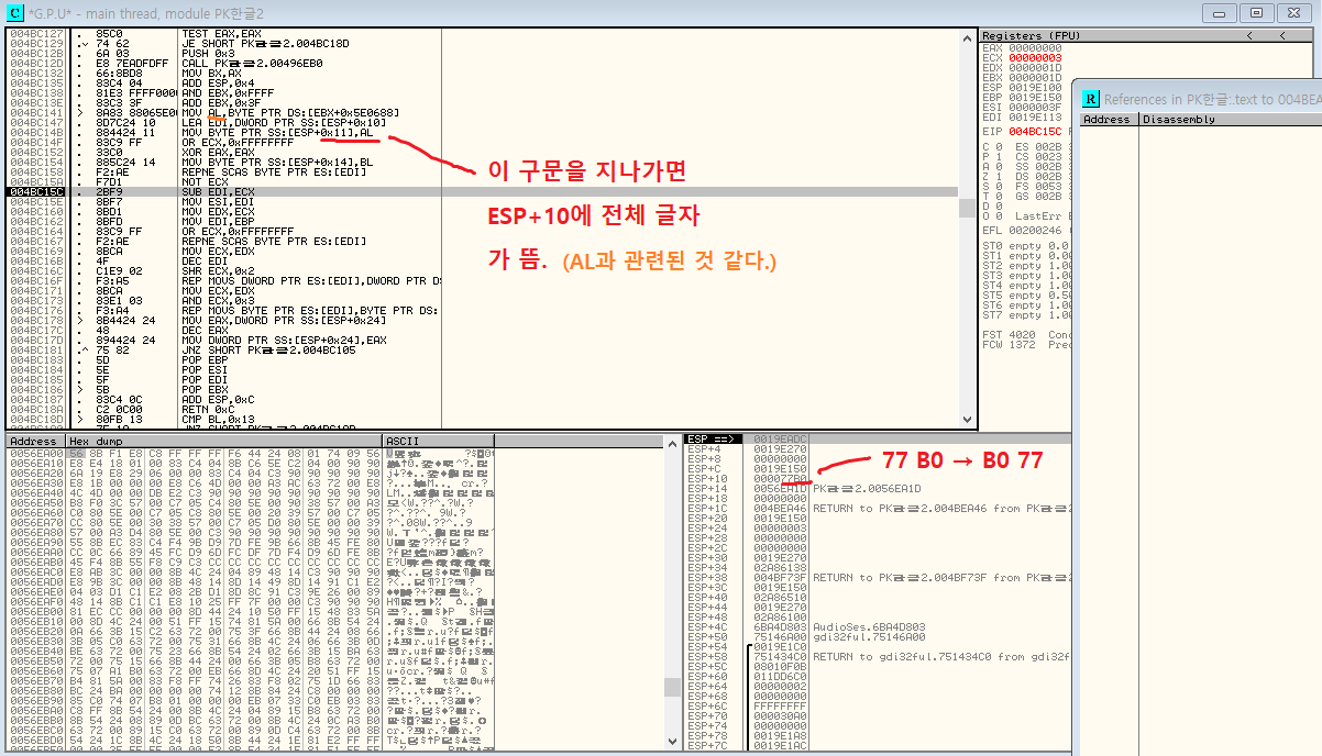 이렇게 삽질을 하다가 MOV BYTE PTR SS:[ESP+0x11],AL 구문을 넘어가면 ESP+10에 77 B0 같은 식으로 값이 들어오는 걸 확인할 수 있었다. 바이트 플립(앞-뒤 바이트 자리 바꾸기)을 하면 B0 77이다.