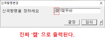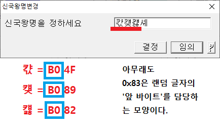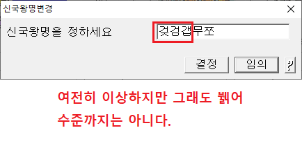 신국왕명 변경 창에서 '임의' 버튼을 클릭해보니, '귺긎' 같은 뷁어가 랜덤으로 출력되는 것을 확인할 수 있었다.