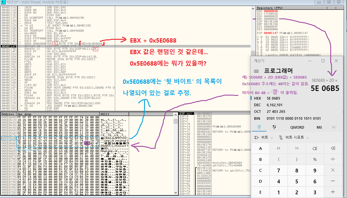 1. 0x5E0688에다 EBX값을 더한다. (0x5E0688 + 2D = 0x5E06B5)
