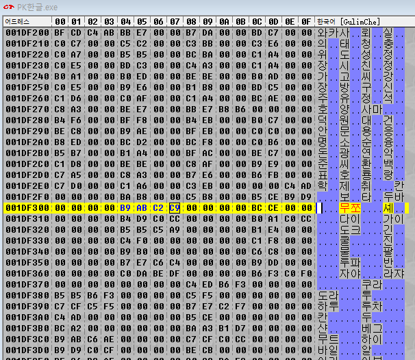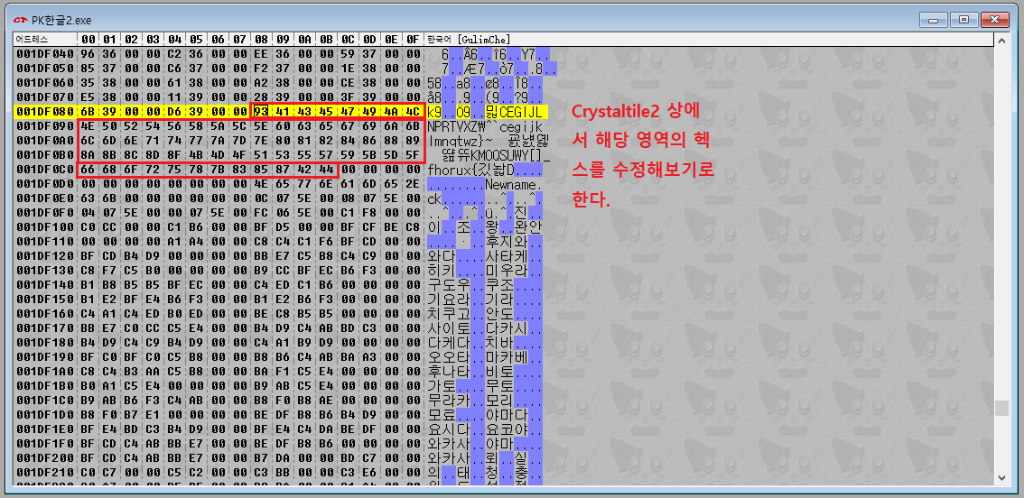 Crystaltile2로 실행파일을 열고 0x1DF088부터 0x1DF0CB 영역에 있는 값들을...