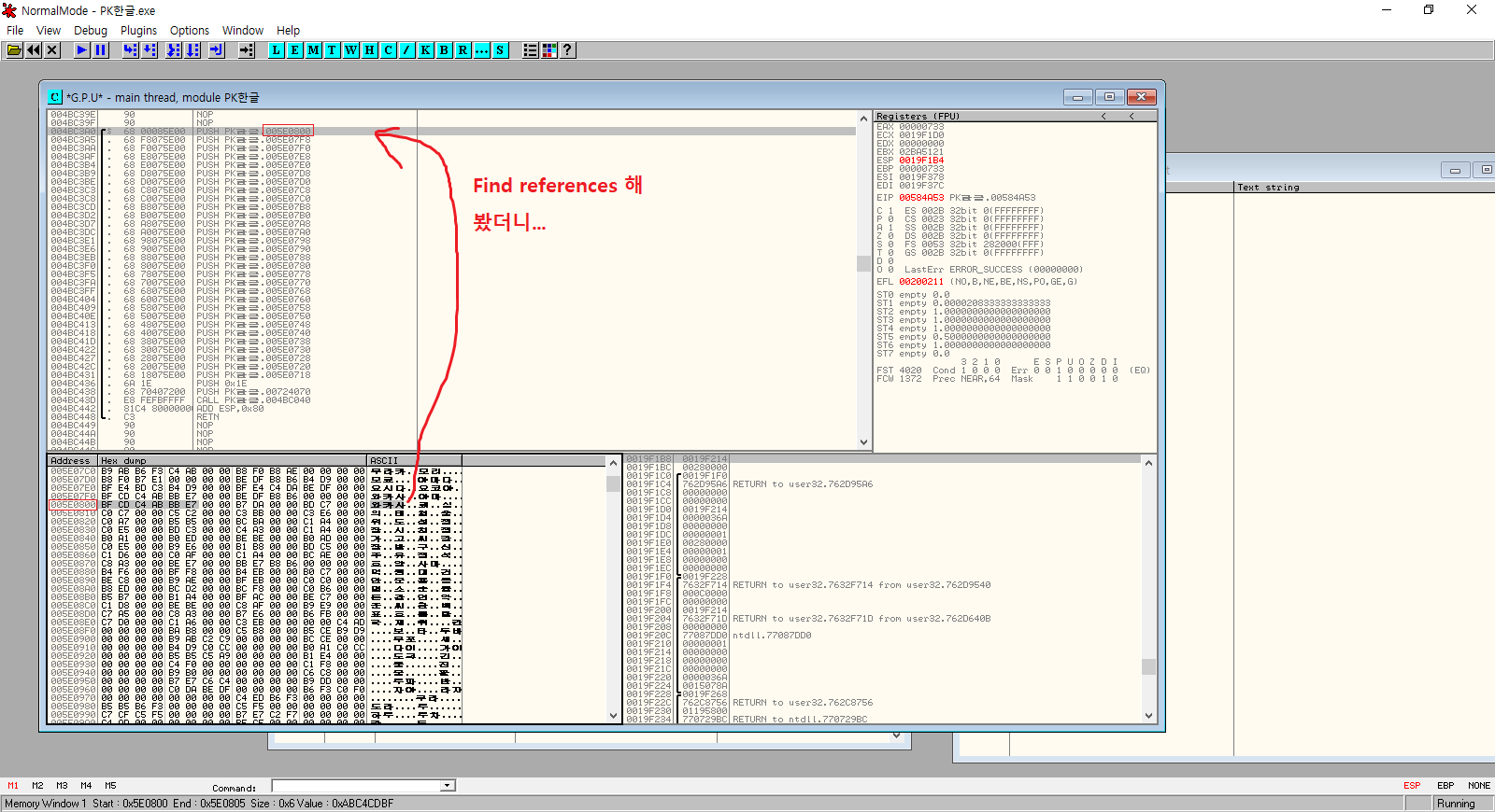 Ollydbg로 실행파일을 연 뒤, Hex dump 쪽에서 지정 이름 아무거나 검색하고 Find references 해보았다. 그러니까 무슨 PUSH들이 여러 개 나열되어 있는 코드가 보였다.