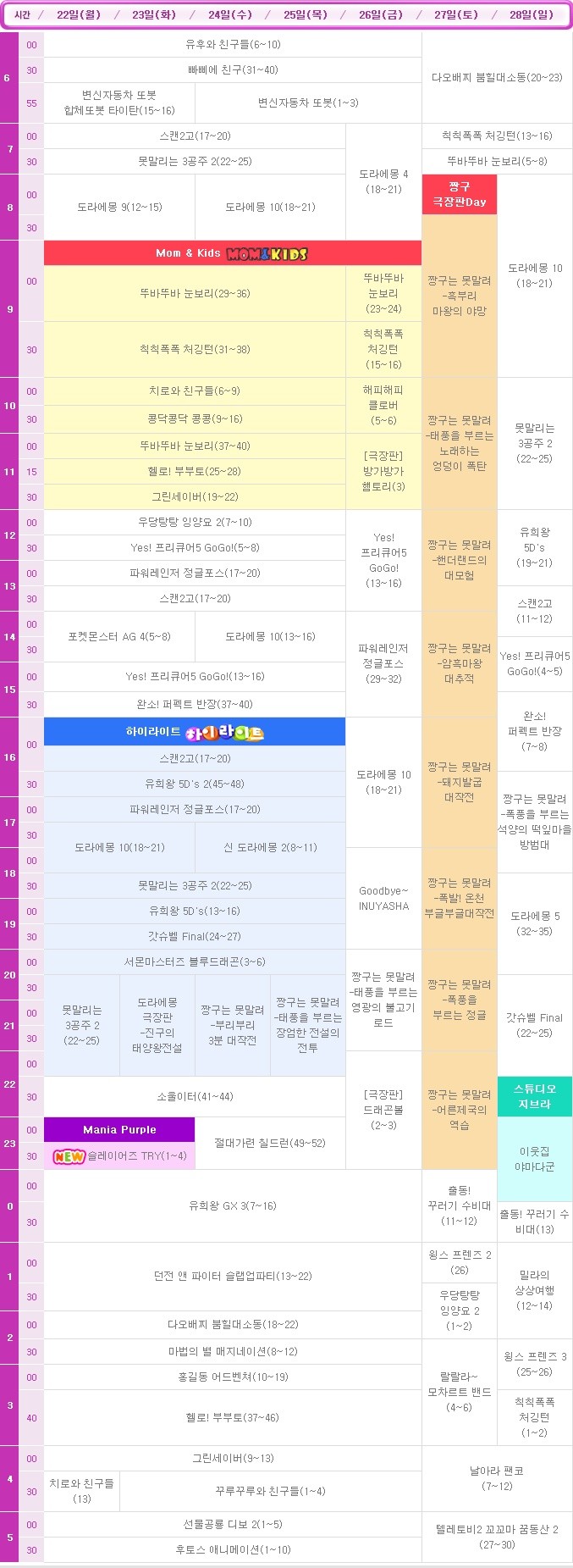 | 4 | 00 | 유후와 친구들 (10~14)* | 윙스 프렌즈 (16~21)* | |||||