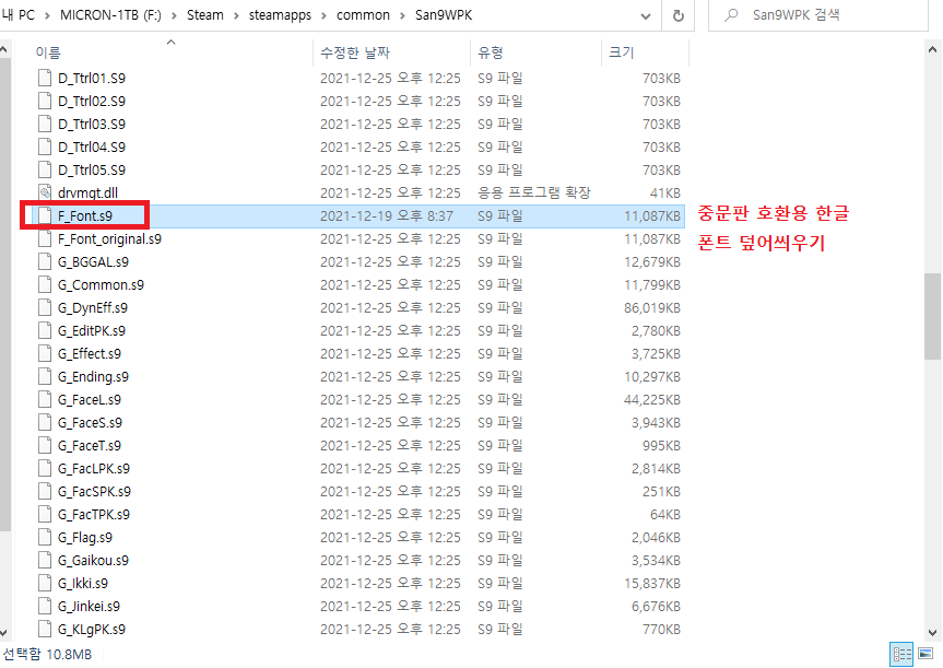 F_Font.s9는 내가 예전에 제작한 중문판 호환용 한글폰트로 교체한다.