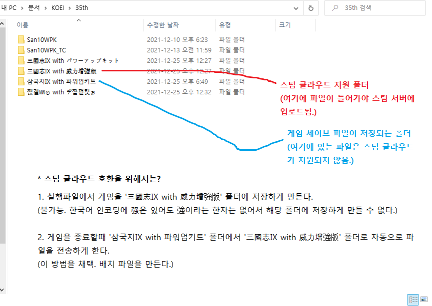 다시 말해, 내가 '三國志Ⅸ with 威力增強版' 폴더 안에 새 폴더를 만들어서 파일을 집어넣어도 스팀 클라우드에 업로드가 된다는 것이다.