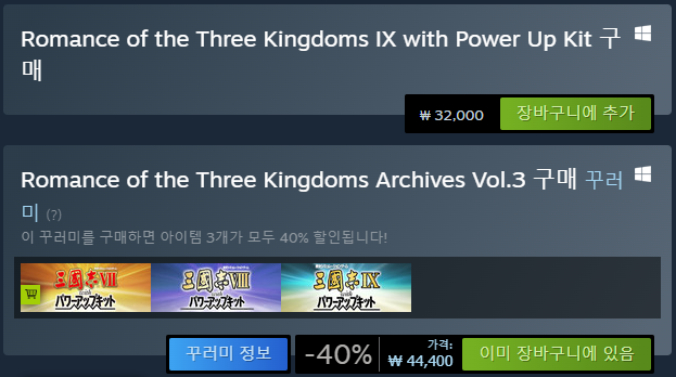 꾸러미로 구입하기로 했다. 삼국지10을 정가로 구입하느라 이미 3만원 가까이 썼는데, 이것까지 사면 약 7만 5천원을 소비하게 되는 셈이다.