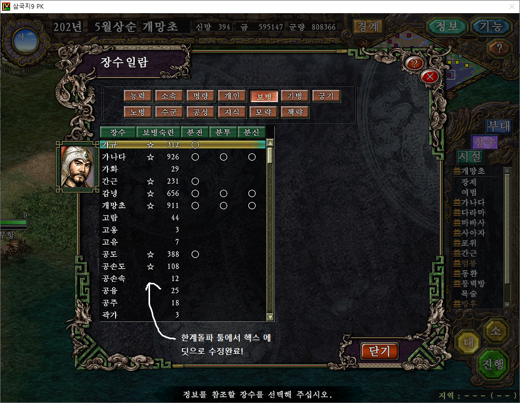 다음으로 할 일은 한계돌파 툴 메뉴 중 '도시수정' '병법수정' 등에서 나오는 목록을 한국어로 출력하게 만드는 것이었다.