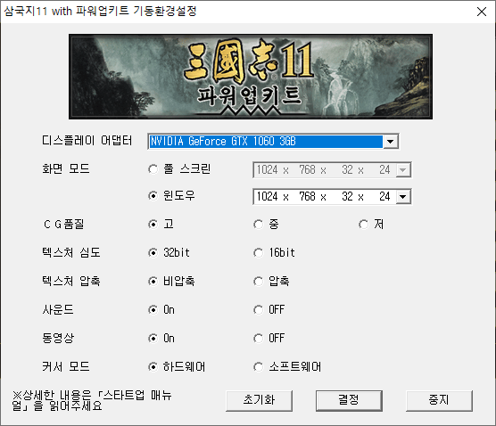 다만 이것만으로는 한글화가 안되고, 여기에 있는 통합한글패치까지 덮어씌워야 삼국지11PK 게임 내부까지 한글화가 이루어진다. (카페 가입 필요)
