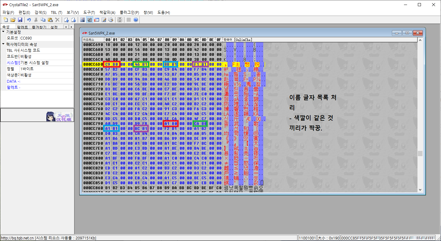 일단 EUC-KR의 한글 2350자만 우겨넣어 보기로 한다. 헥스 값은 바이트 플립 (앞 바이트 / 뒷 바이트를 거꾸로) 해서 Crystaltile2 상에다 삽입한다.