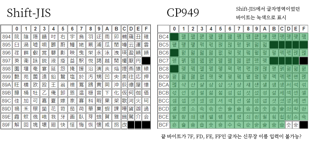 그러나 일본어 인코딩(Shift-JIS)이 뒷 바이트로 0x7F, 0xFD, 0xFE, 0xFF의 뒷 바이트를 사용하지 않는다.