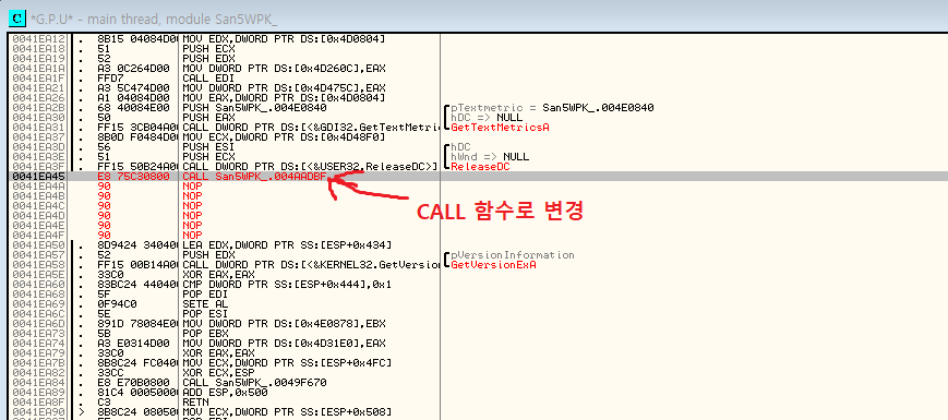 다시 ReleaseDC 밑으로 돌아가서, 해당 자리를 CALL 004AADBF 로 바꾼다.