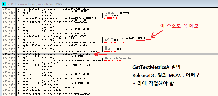 004E0840은 아까 메모한 pTextmetric의 주소다. 그리고 MOV... 어쩌구는 아까 ReleaseDC 밑에 있던 코드를 옮겨 적은 것이고, RETN은 다시 제자리로 복귀하는 명령이다.