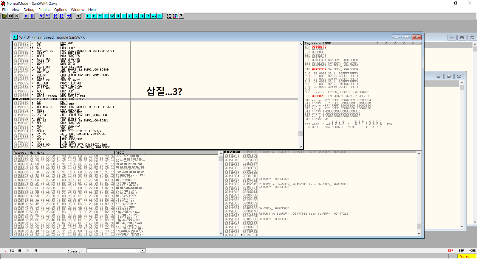 그러면 프로그램은 004AADBF까지 가서 코드를 실행하고 다시 이 자리로 돌아오게 될 것이다.