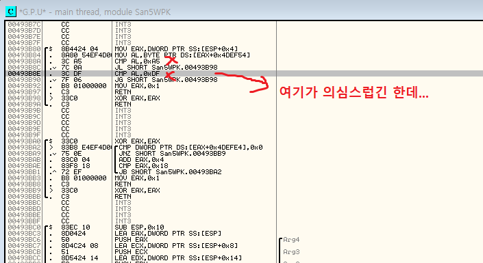 보통 CMP **, 0xA6 으로 검색해보면 의심스러운 코드가 찾아지는데 이상하게도 이 실행파일에서는 검색이 되지 않았다.