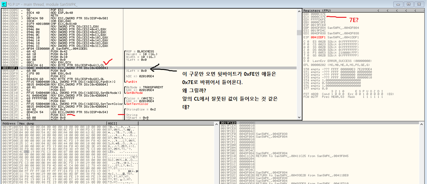 나는 이 문제 때문에 다시 Ollydbg에서 온갖 삽질을 하다가 TextoutA 함수 근처에서 한 가지 사실을 알아냈다.