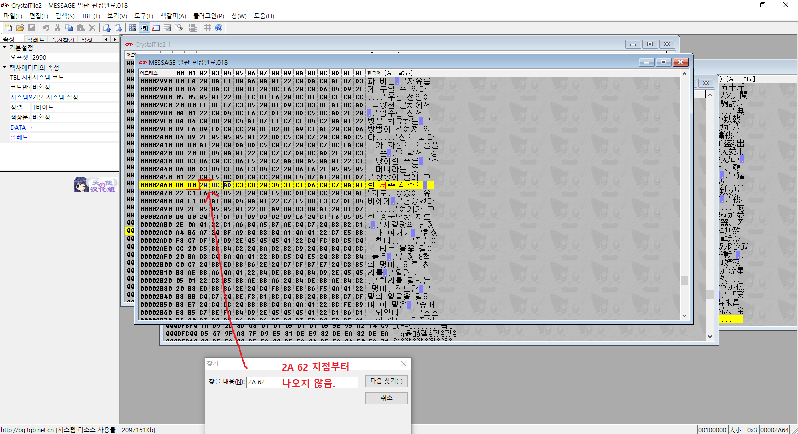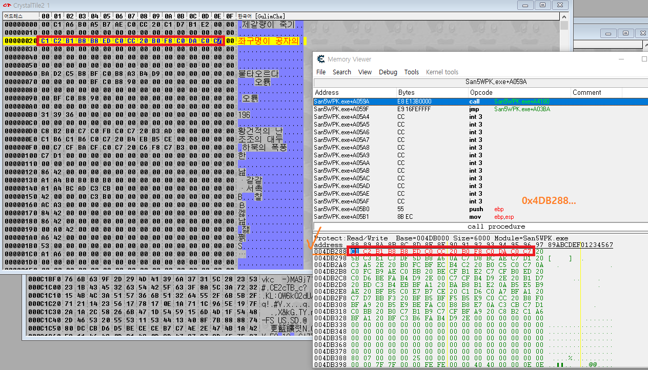 바이트를 검색해보니 0x4DB288에서 지금 화면에 출력되고 있는 문장이 나왔다. Crystaltile2 상에서 해당 바이트를 쳐보니까 맞아 떨어진다.