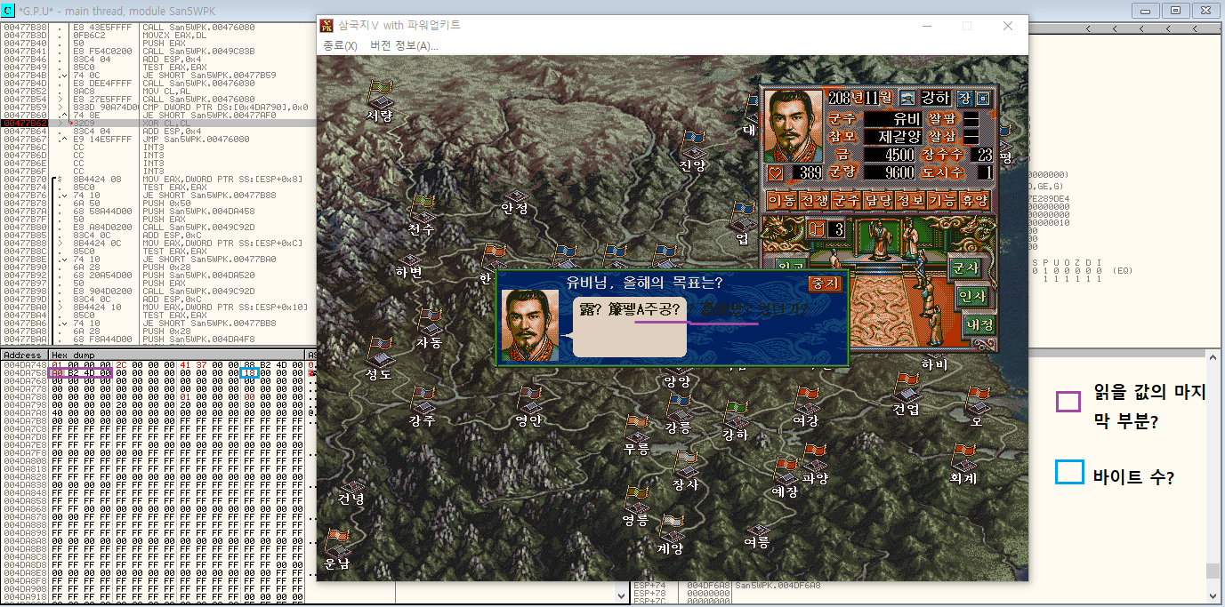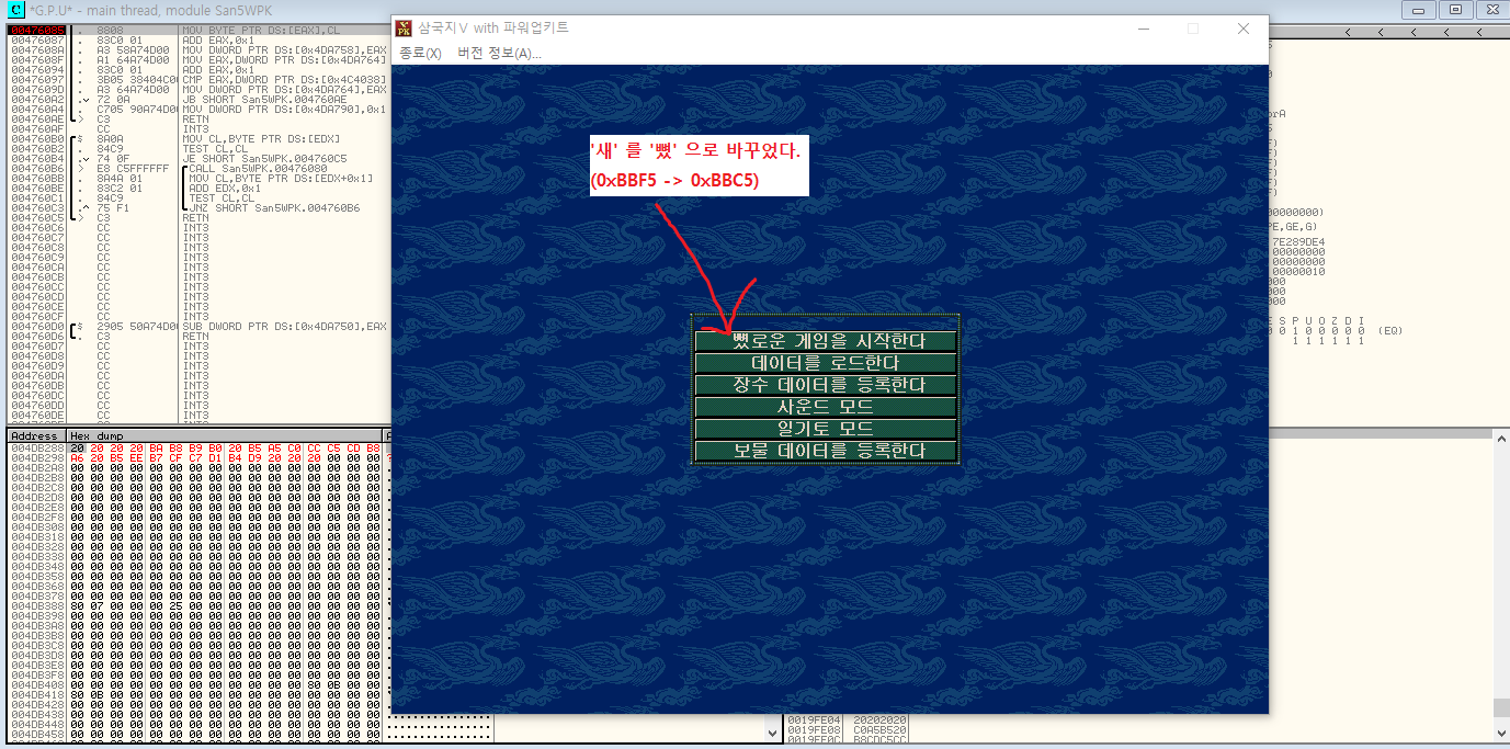 시험 삼아 00476085에다 브레이크 포인트를 걸고 한 단계 진행 후 왼쪽 아래의 헥스코드를 수정하고 진행시켰더니 '새' 자를 '뼜' 자로 바꾸게 할 수도 있었다.