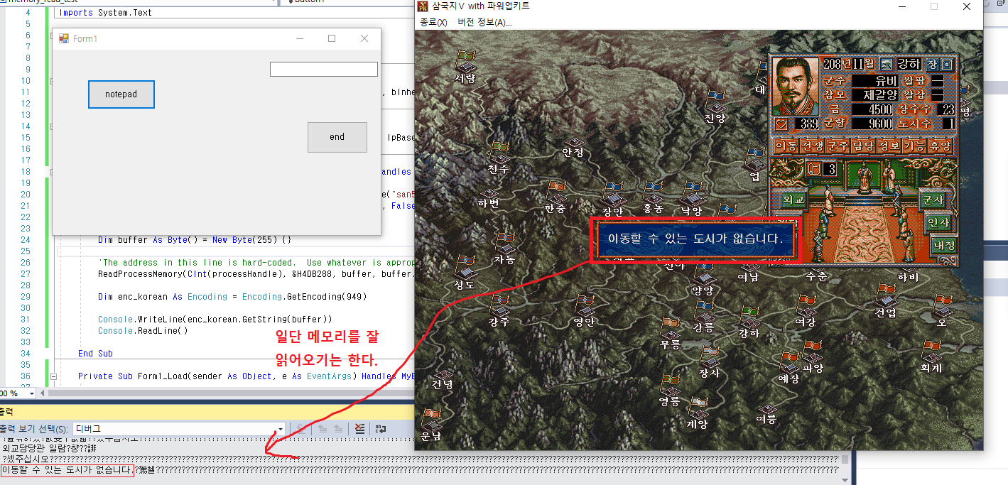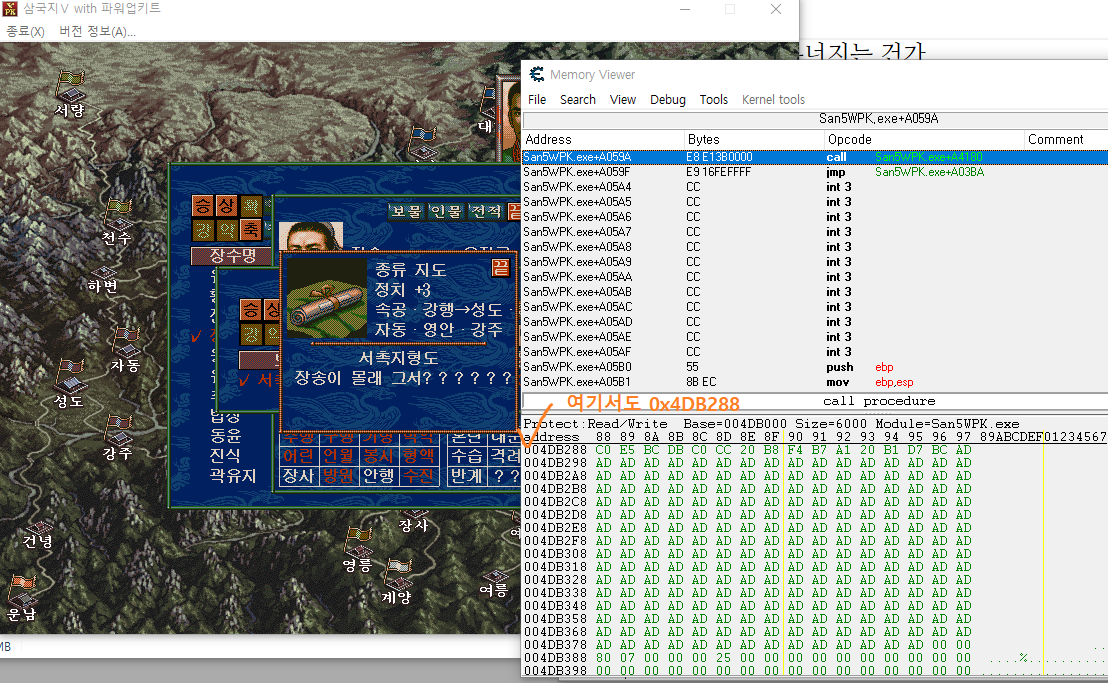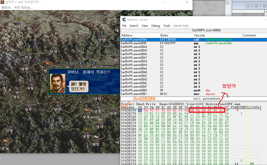 치트엔진 상에는 한글이 표시되지 않아서 좀 불편한 감이 있다. 그래서 나는 메모리 주소의 값을 읽어오는 소스를 구해서(출처) 0x4DB288의 값을 잘 가져오는 지 확인해보기로 했다.