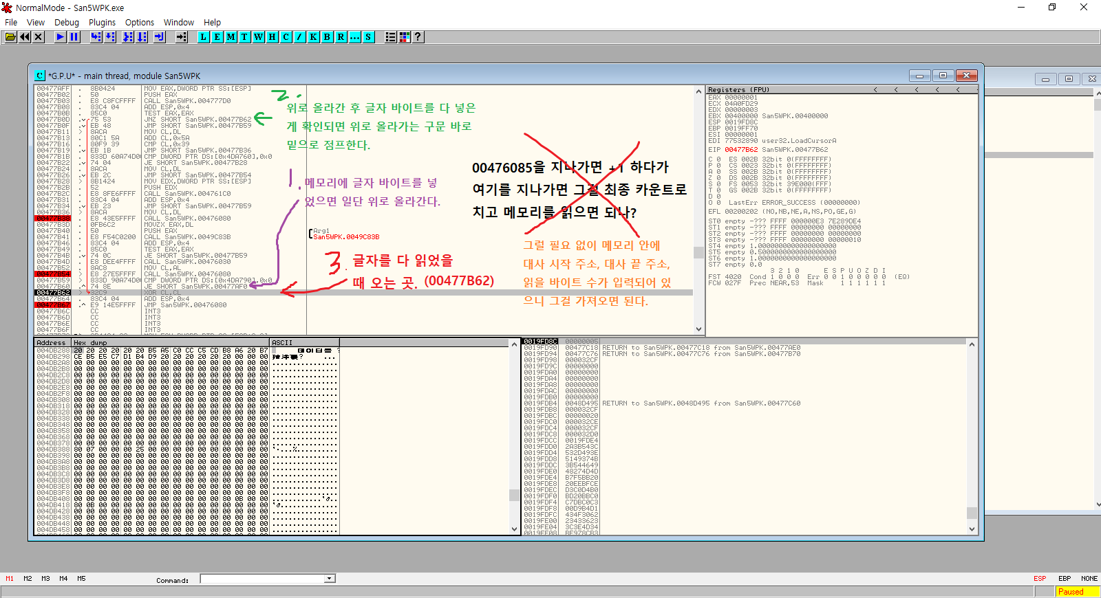 다른 바이트들에도 메모리 브레이크를 걸고 계속 조사해보니, 프로그램이 00477B62 지점에 도달해야 문장을 전부 읽은 것으로 판단이 된다. (다 안 읽었으면 JE 구문이 위로 올려버린다.)