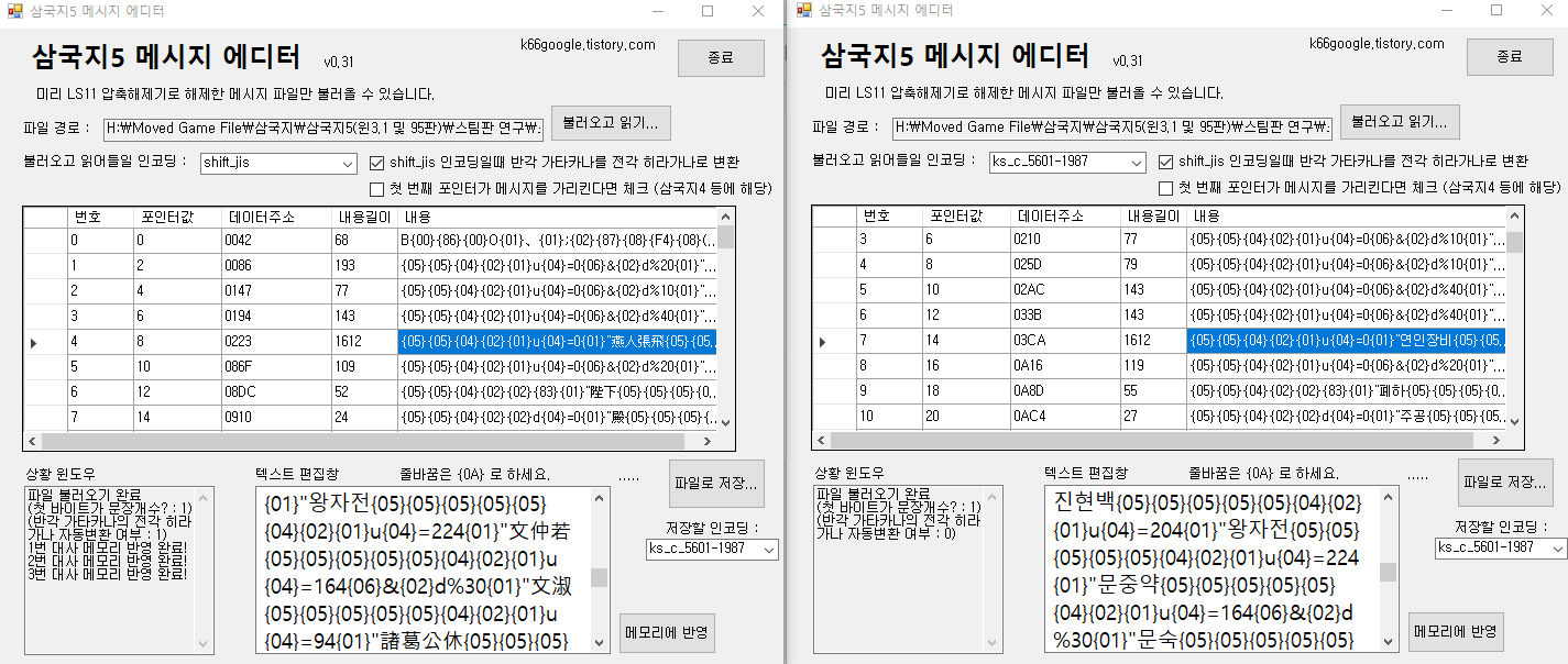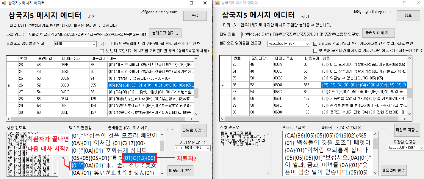 삼국지5PK의 메시지 파일은 총 56개(000~055)로, 일판과 한글판 모두 개수가 같다. 하지만 한글판 파일을 그냥 통째로 교체하면 튕겨버리므로, 제어코드는 내버려두고 대사만 하나하나 복사+붙여넣기 신공을 해야 할 필요가 있다.