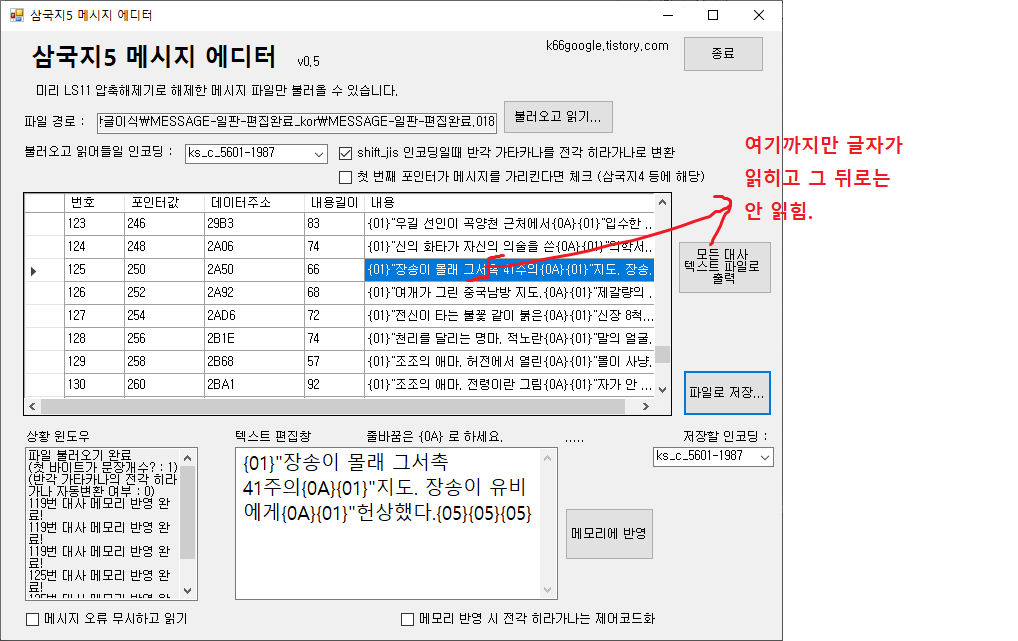 이런 식으로 메모리에 들어온 문장을 바꿔서 화면에 출력시킬 수가 있다. 바로 이 방법이 메시지 파일 용량 제한 문제를 돌파할 수 있는 열쇠인 것이다.