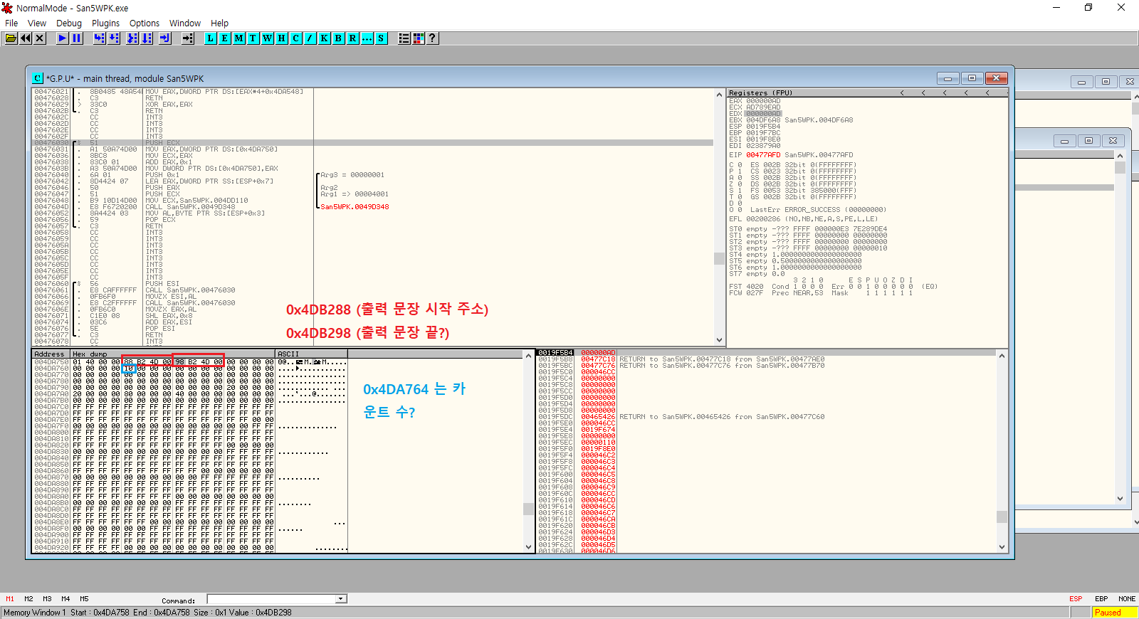 출력 문장 시작 주소는 항상 0x4DB288로 같았고, 끝 주소와 바이트 수는 문장의 길이에 따라 달라졌다.