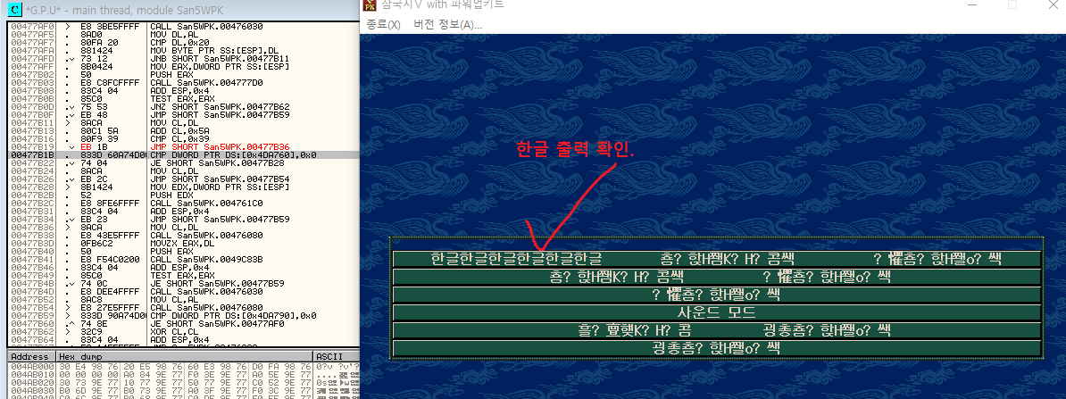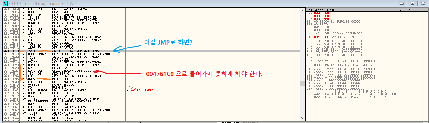 결과값을 보니 00477B2C에서 호출하고 있었다. 위쪽에서 이 호출 부분을 뛰어넘을 수 있는 점프 구문이 있나 찾아보았다... 아! 위에 JA 구문을 JMP (무조건 점프) 로 바꾸면 여기를 무조건 뛰어넘을 수 있을 것이다. 이 호출을 뛰어넘으면 전각 히라가나 강제변환도 발생하지 않을테니까 '한글' 이라고 정상적으로 출력될 것이다... 이론적으로는.