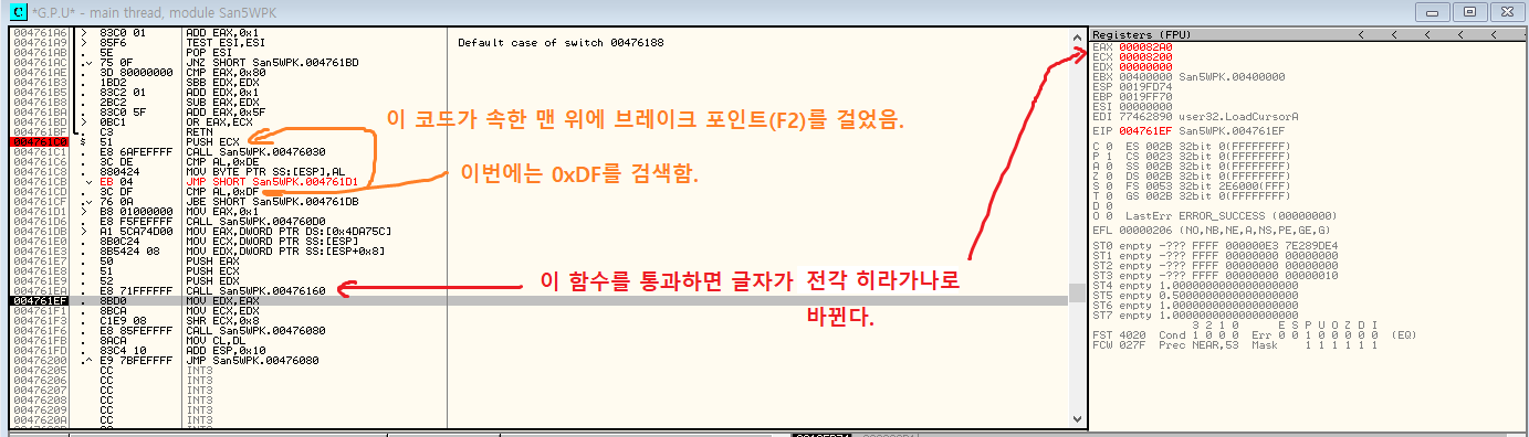 F8을 눌러 한 단계 씩 내리다가 004761EA를 통과하니까 EAX가 82A0으로 바뀌었다. 82A0은 전각 히라가나 'あ' 자다. 바로 여기서 전각 히라가나로 강제변환하는 함수를 호출하고 있는 것이다.
