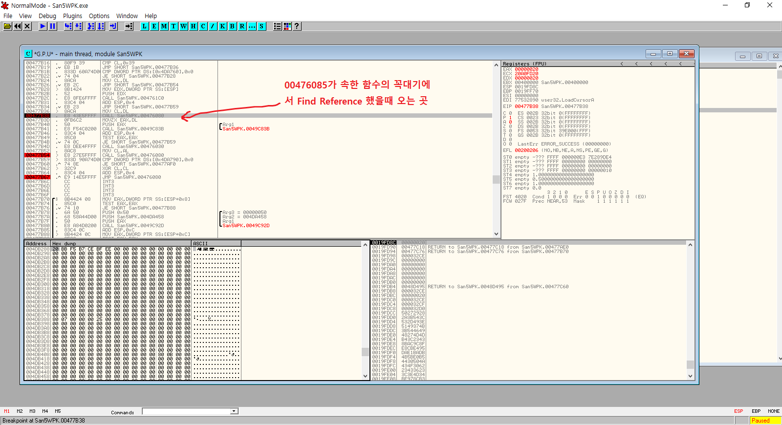 그럼 00476085가 속한 함수는 누가 호출하고 있는 것일까? 함수의 꼭대기(00476080)에서 Find reference를 해보니까 00477B38에서 부르고 있는 걸 알아냈다.
