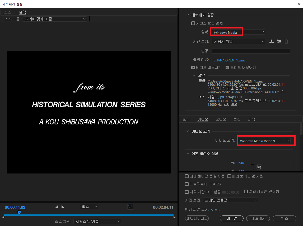 처음에 나는 이 영상을 프리미어 프로에서 H264 mp4로 인코딩하고, 샤나인코더로 wmv 파일로 재인코딩해서 게임에 집어넣었다. 삼국지5PK 쪽은 문제없이 재생되었다. 그러나 삼국지4PK 쪽에서 문제가 발생했다. 동영상이 중간까지만 재생되고 끊기는 것이다. 비디오 코덱을 wmv2 코덱으로 인코딩한 것이 문제였던 것이다.