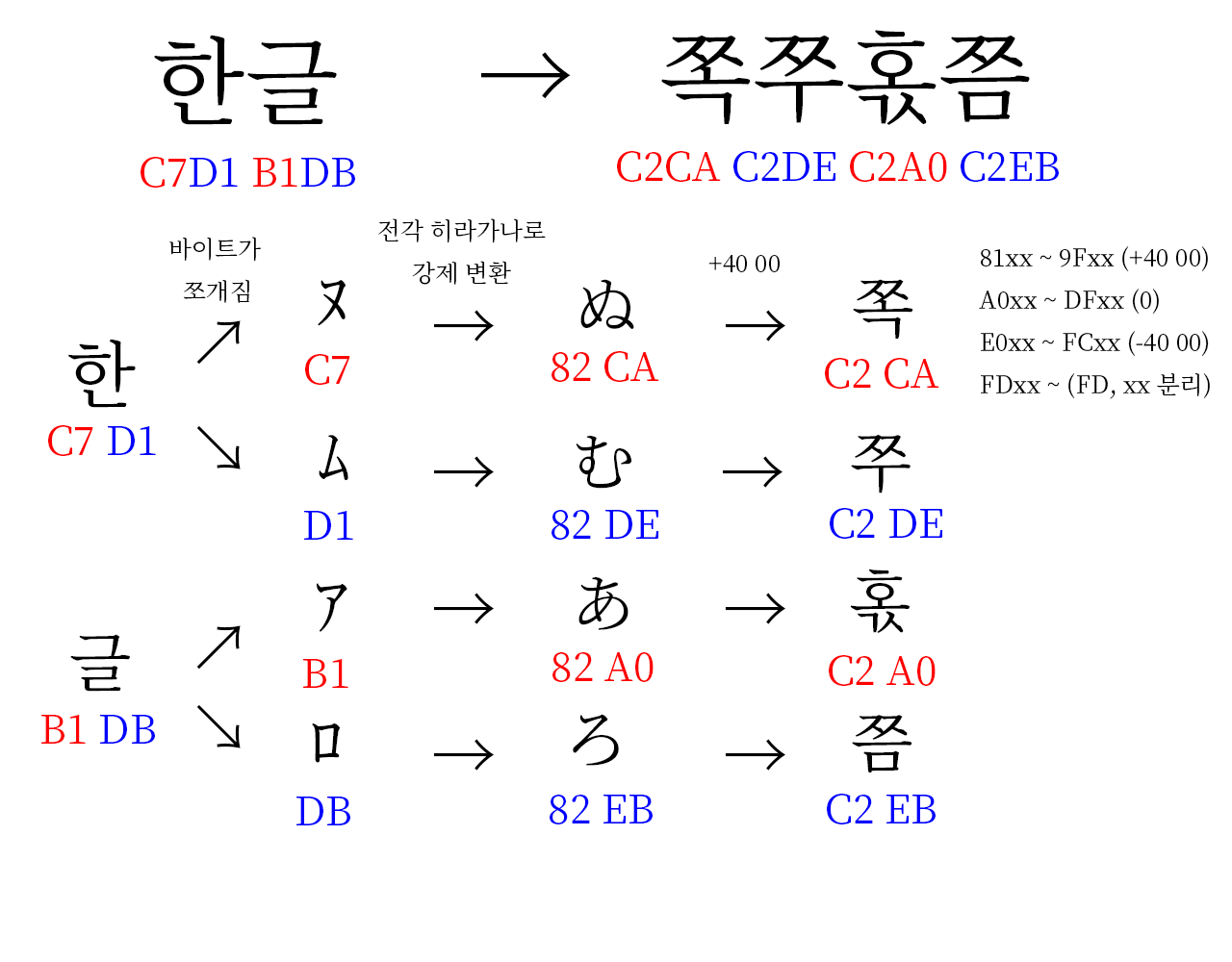 '한글'이 바이트가 쪼개지고, 쪼개진 바이트가 반각 가타카나 취급을 받고, 그래서 전각 히라가나로 강제변환이 되고, 강제변환 된 전각 히라가나에 임의의 값이 더해져서 최종적으로 '쪽쭈혻쯤'이 되는 이런 괴변환 현상이 벌어지는 것이다.