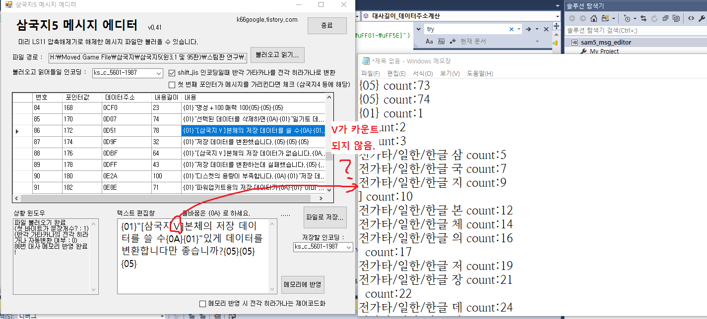 복붙 신공을 하기 위해 VB.Net으로 조악하게 메시지 에디터를 만들었다. 한국어나 일본어 한자만 문자로 출력시키고, 제어코드 같은 건 {00} 이런 식으로 나오게 하였다.