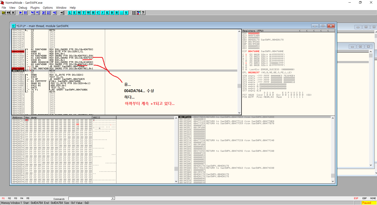 00476085의 주변에 나온 주소들을 뒤져보던 중... 004DA764에서 바이트를 +1씩 더하고 있는 모습이 포착되었다.