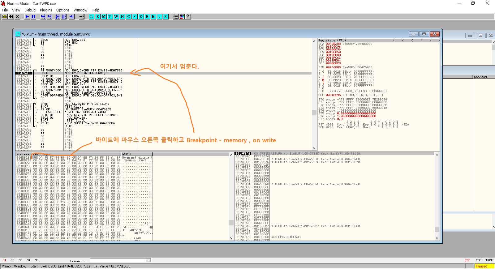 그런 다음, 4DB288의 바이트를 마우스 오른쪽 클릭하고 Breakpoint - memory, on write 눌러준다.
