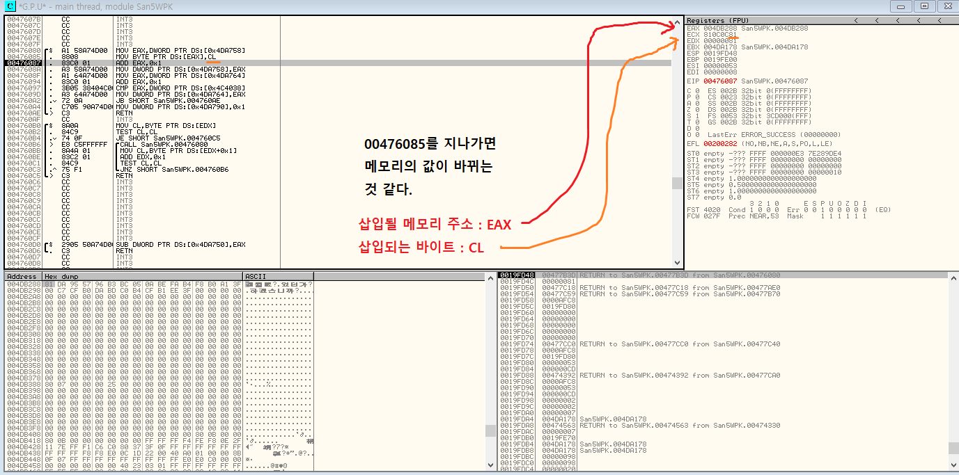 멈췄을때 F8을 눌러서 한 단계 진행하면 4DB288의 바이트 값이 변화한 것을 확인할 수 있었다. 바이트 값은 CL에 나와있고, 값을 넣을 메모리 주소는 EAX에 나와있다.