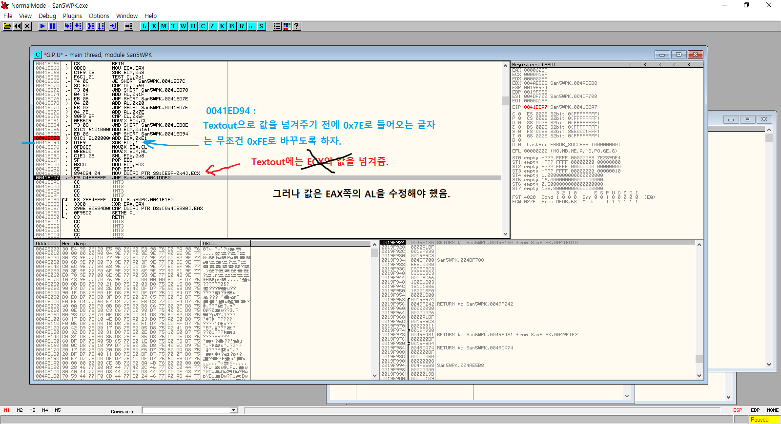 어셈블리 수정을 통해 0xFD 글자들은 출력시키는 데 성공했으나 0xFE 글자들은 여전히 출력이 ?로 뜨는 상태다.