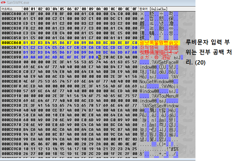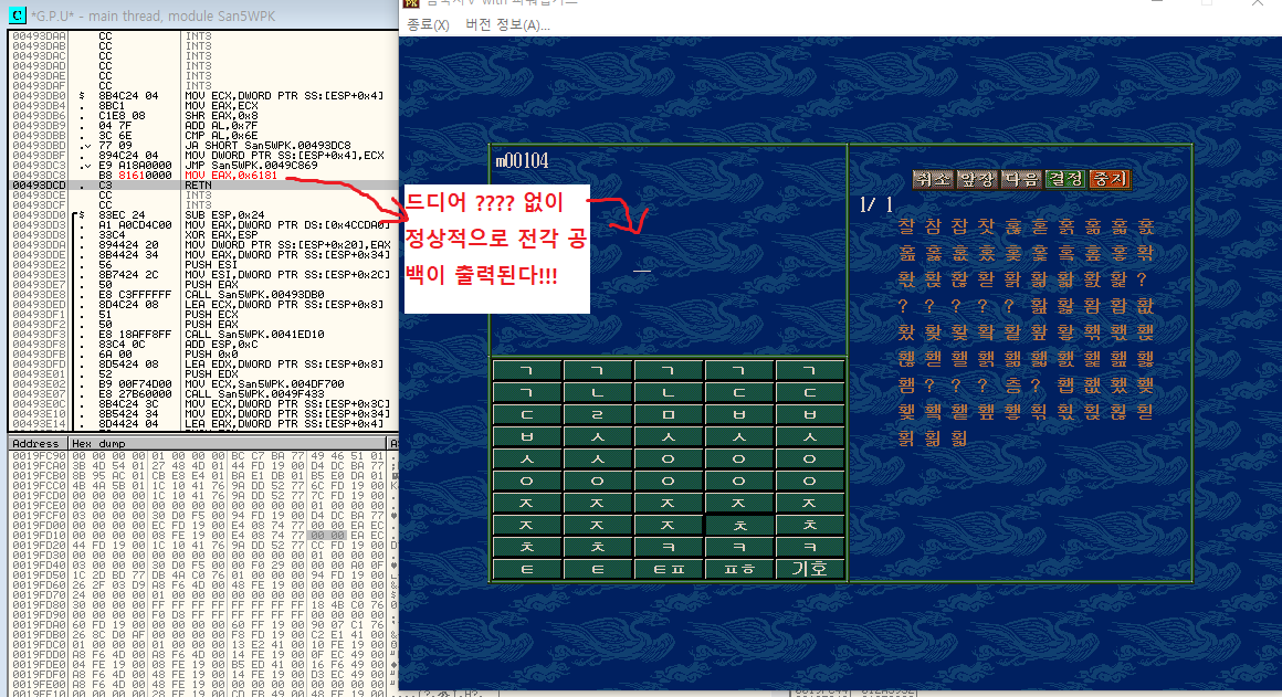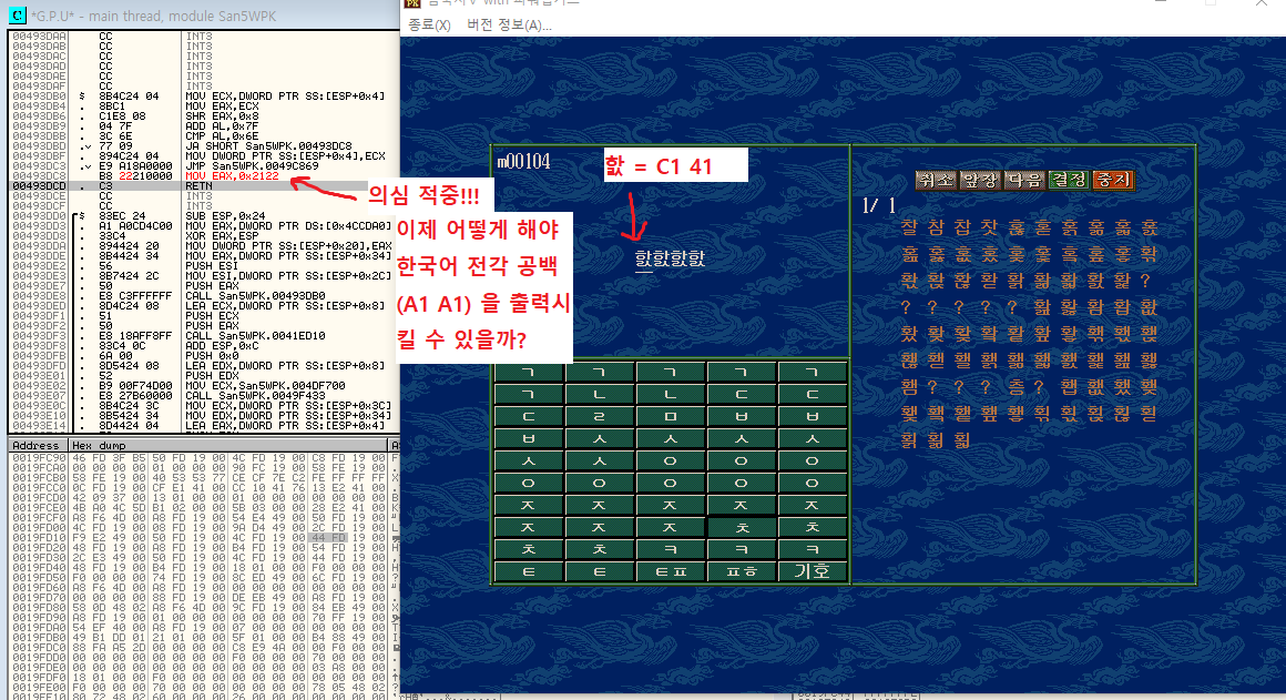 바로 여기가 ?와 관련이 있었던 곳이다. 이걸 어떻게 해야 한국어 전각 공백인 0xA1A1으로 바꿀 수 있을까? 수작업으로 변하는 값을 계속 확인해보았다. 추론은 다음과 같다.