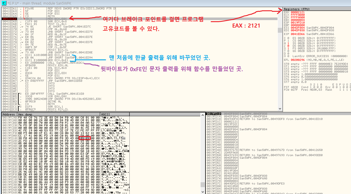이번에는 함수 꼭대기 부분 (0041ED66) 에 브레이크 포인트를 걸고 진행하기로 한다. 여기에 브레이크를 걸면 EAX값에 프로그램 자체 문자코드를 확인할 수가 있다.