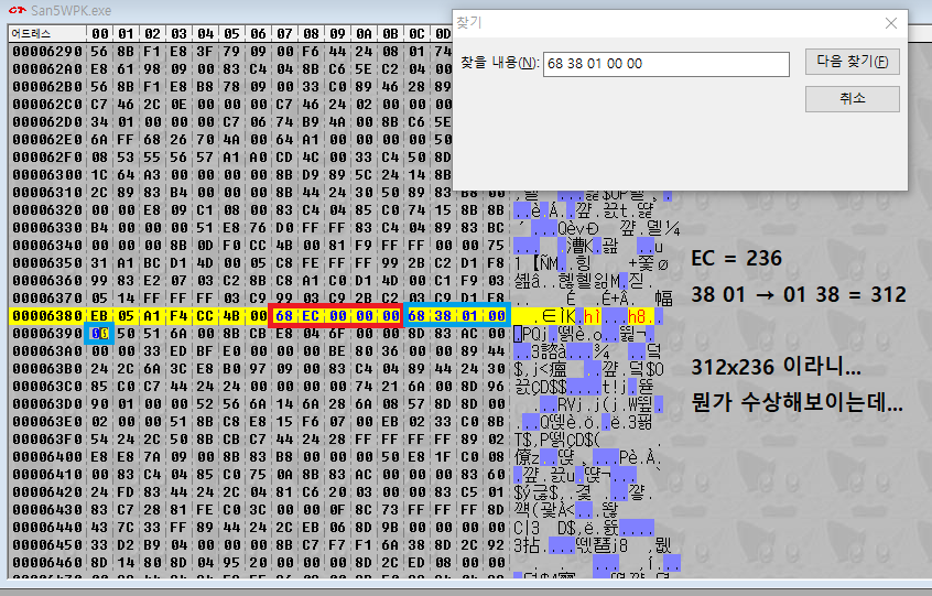 310이 16진수로 136이니까... 68 36 01 00 00 으로 검색해본다. 안 나온다.
