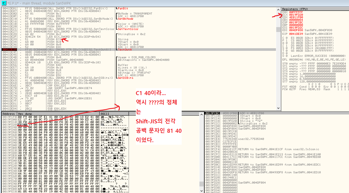 아무래도 2바이트 문자를 출력하는 TextOutA 함수에다 브레이크 포인트를 걸고 지켜보는 수밖에 없겠다.