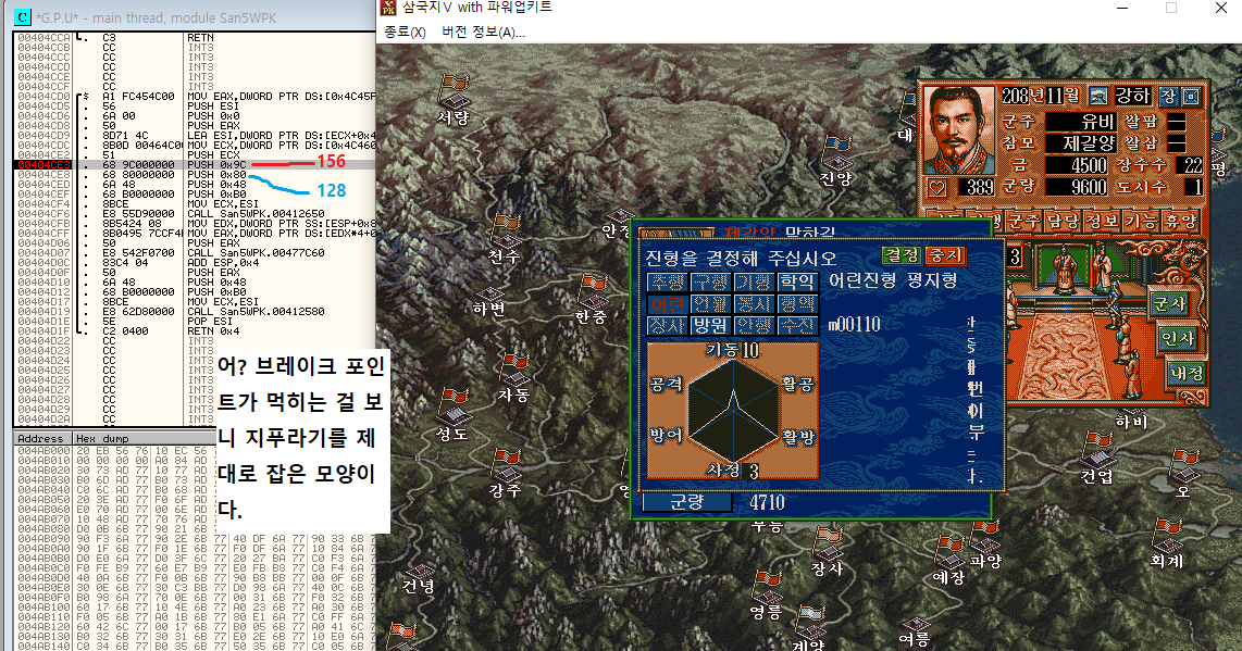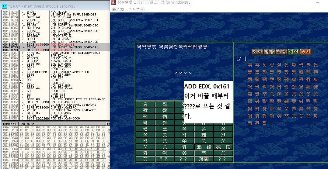 Ollydbg 상에서 삽질을 거듭하다가 한글화가 안 된 삼국지5PK 실행파일을 열고 맨 처음부터 한 단계 씩 바꿔가면서 어느 시점에서 ?로 바뀌는지 확인해보았다. ADD EDX, 0x161 변경 때부터 ?가 튀어나오기 시작한다. 그럼 로케일과 관련이 있다는 거니까 이 녀석이 0x8140일 가능성이 더욱 높아진다.