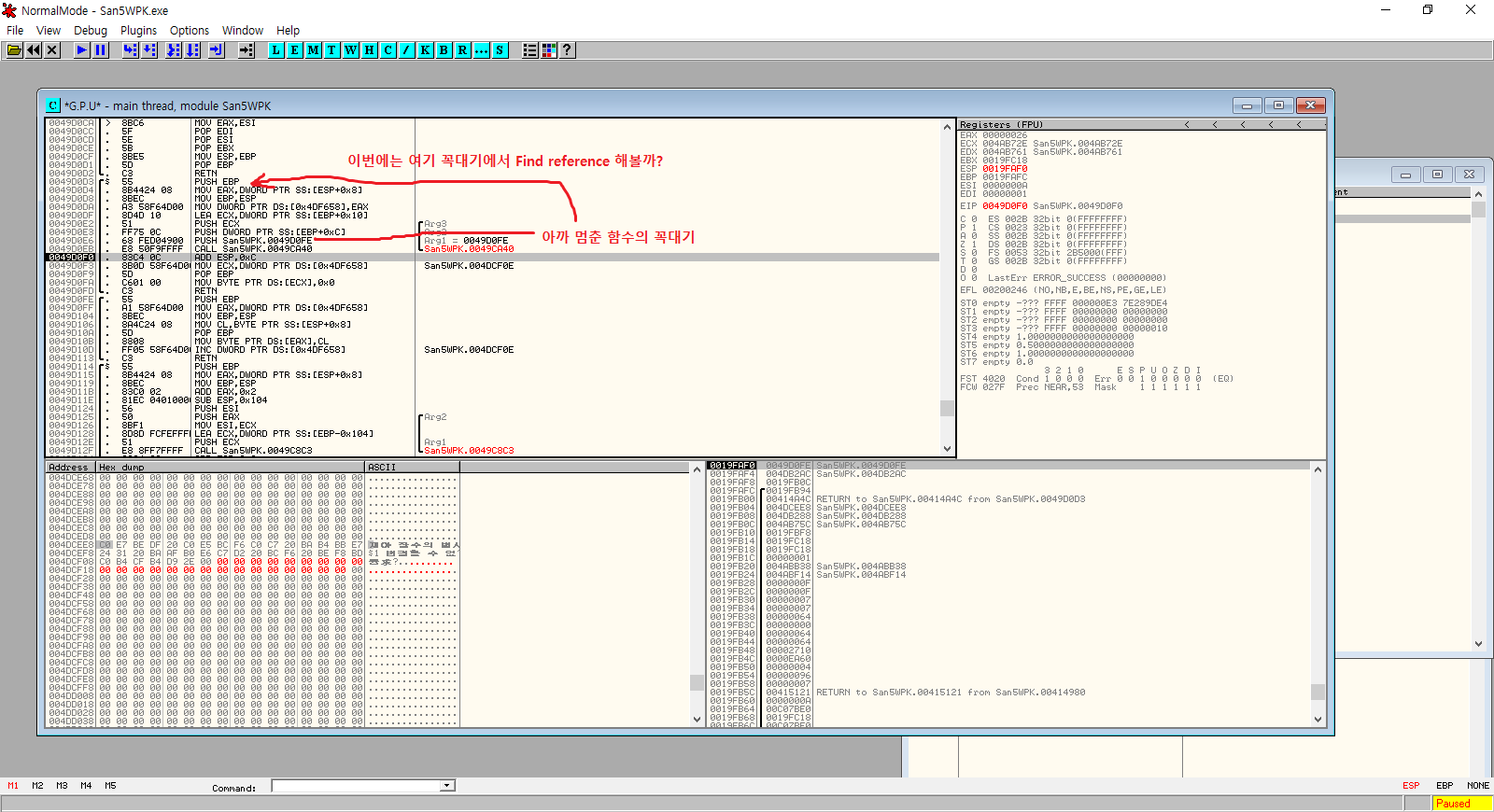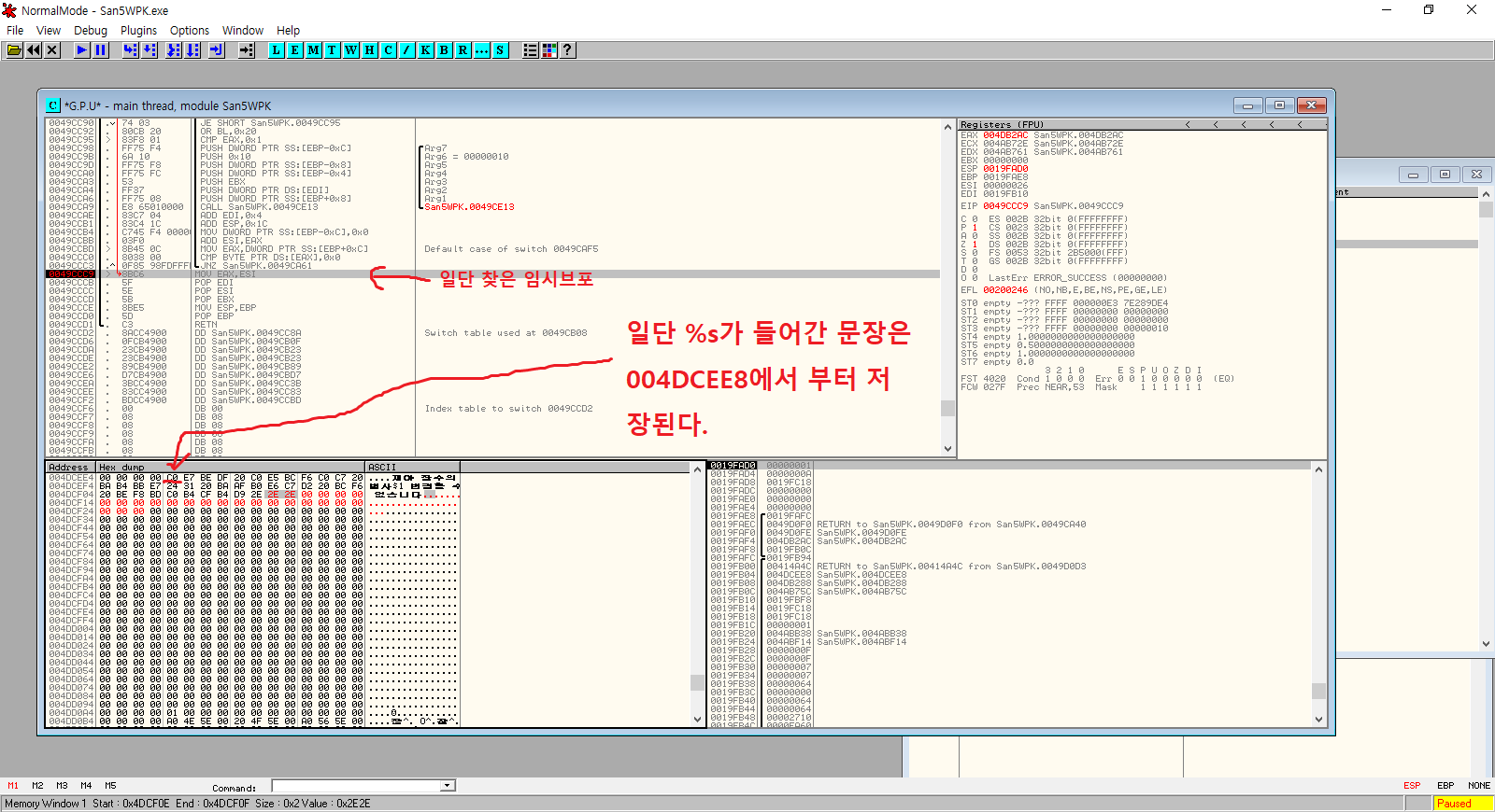 문장 완성은 0049CCC9인데, 여길 브레이크 포인트로 삼으면 안된다. %s 처리와 관련없는 애들도 모두 이쪽을 사용하고 있기 때문에 계속 브레이크가 걸린다. 따라서 다른 곳을 찾아야 한다.