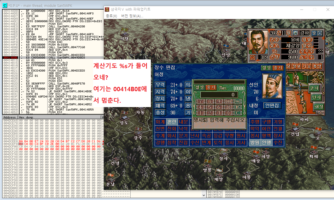 조사 도중 계산기 쪽에도 %s가 포함된 문장이 들어오는 것을 포착했다. 얘는 00414B0E에서 멈추므로, 다음 주소인 00414B13이 최종 브레이크 포인트다.