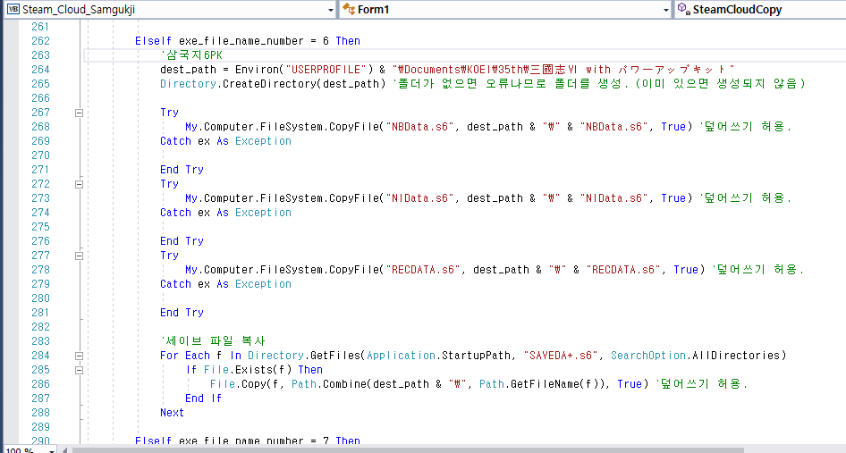 그래서 이번에 삼국지5PK 한글 출력패치를 배포하는 김에 다른 삼국지 버전들의 한글 출력 패치도 배치 파일이 아닌 VB.Net으로 만들어진 exe 파일을 사용하도록 바꾸었다.