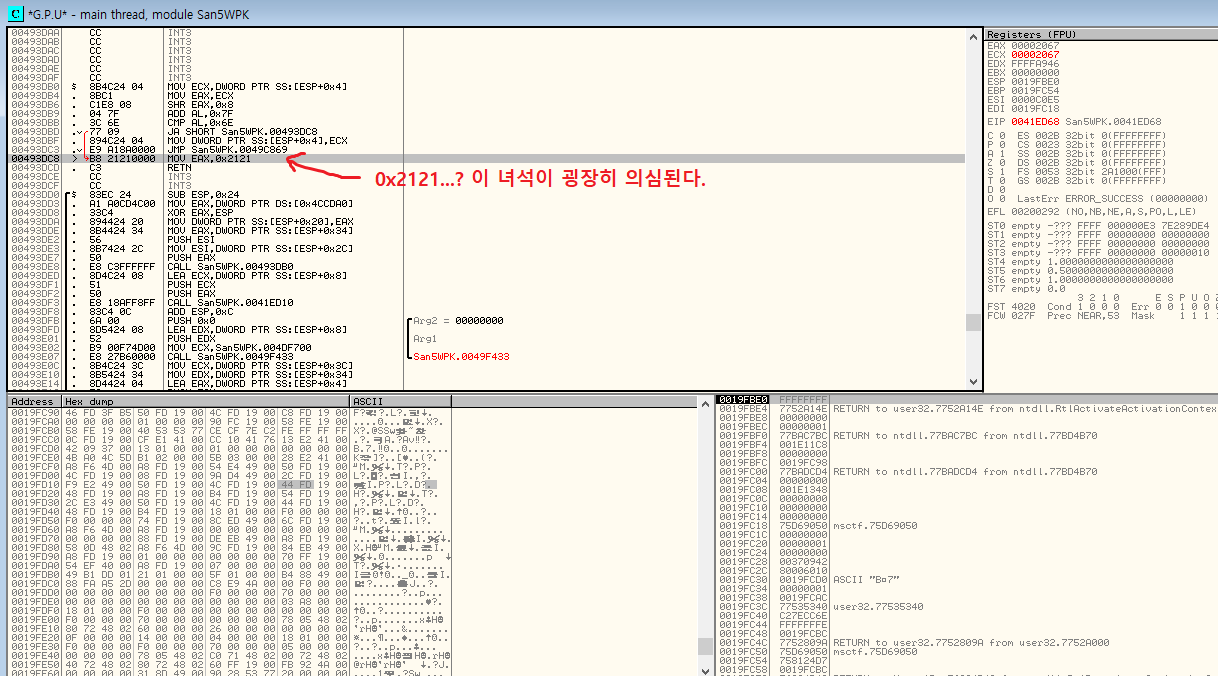 혹시 0x8140으로 값을 넣는게 아니라, 프로그램 자체 문자코드인 0x2121로 값을 넣고 있는건가? 검색해보니 아주 수상쩍은 코드가 하나 나왔다. (MOV EAX, 0x2121)