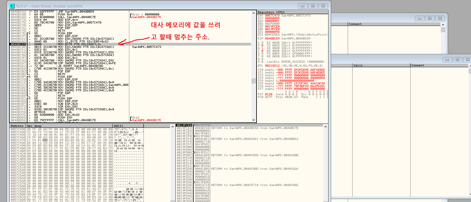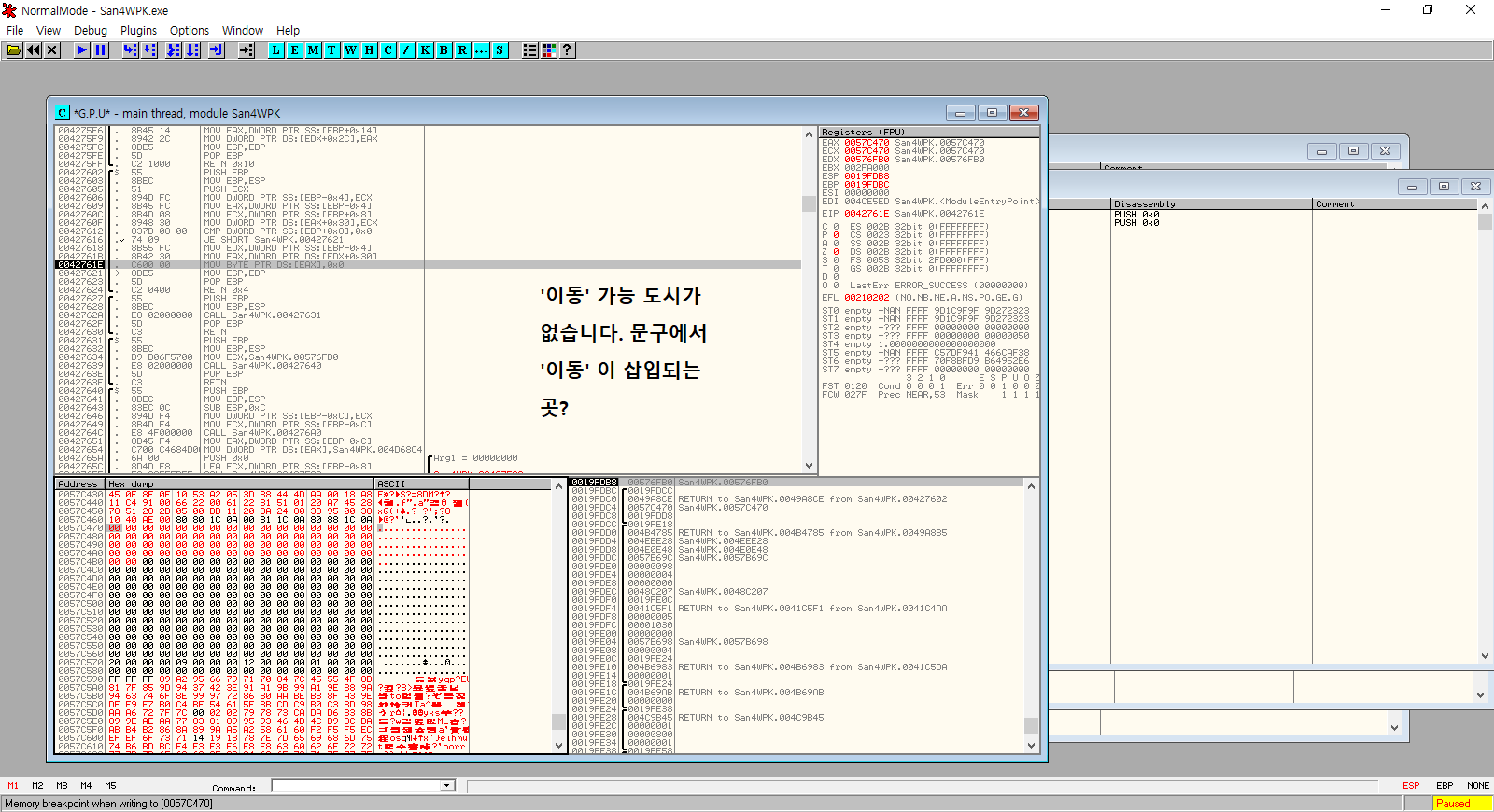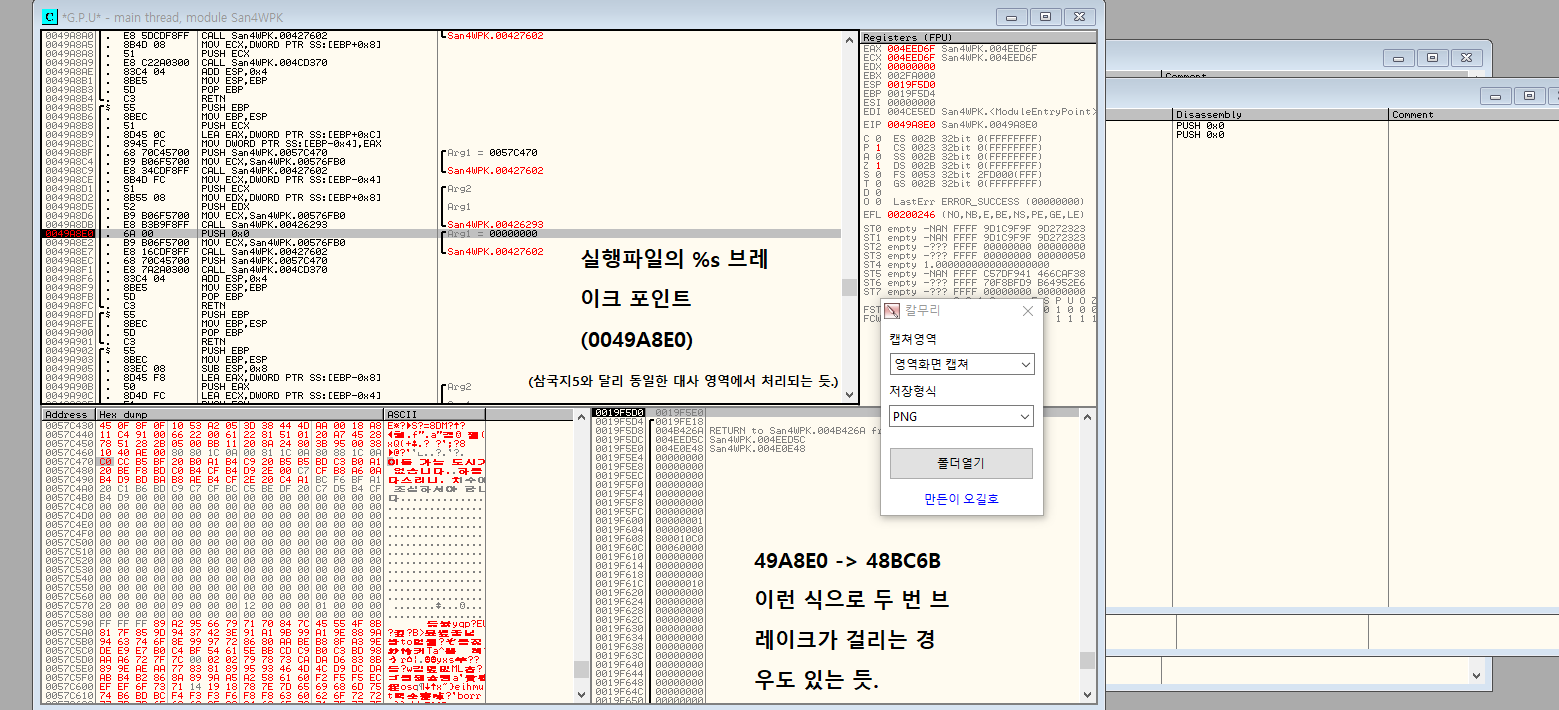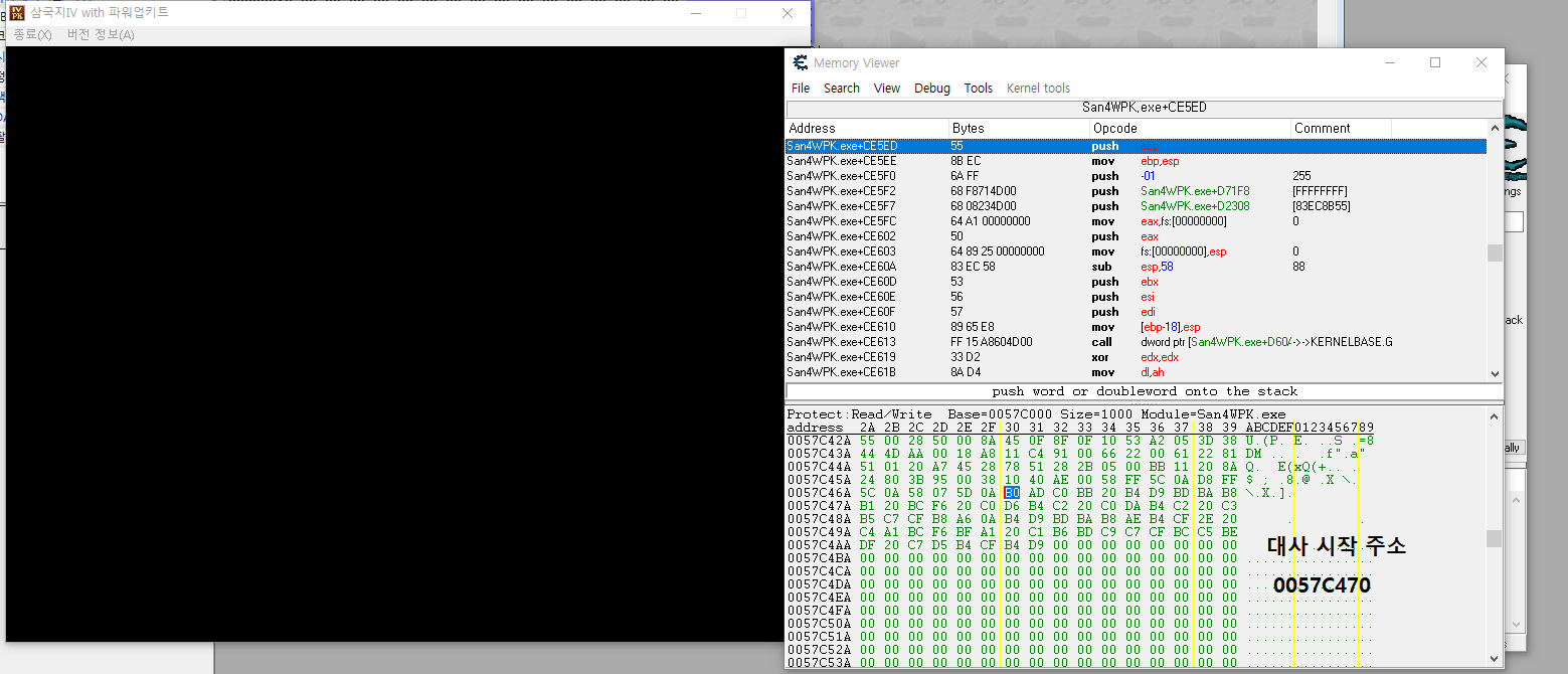 이 오류의 발동 조건이 뭔지 정확하게 알 수 없어서 헤매고 있었는데, 우연히도 Ollydbg로 삼국지4PK를 디버그 하는 도중에 발생해줘서 문제의 원인을 파악할 수 있었다.