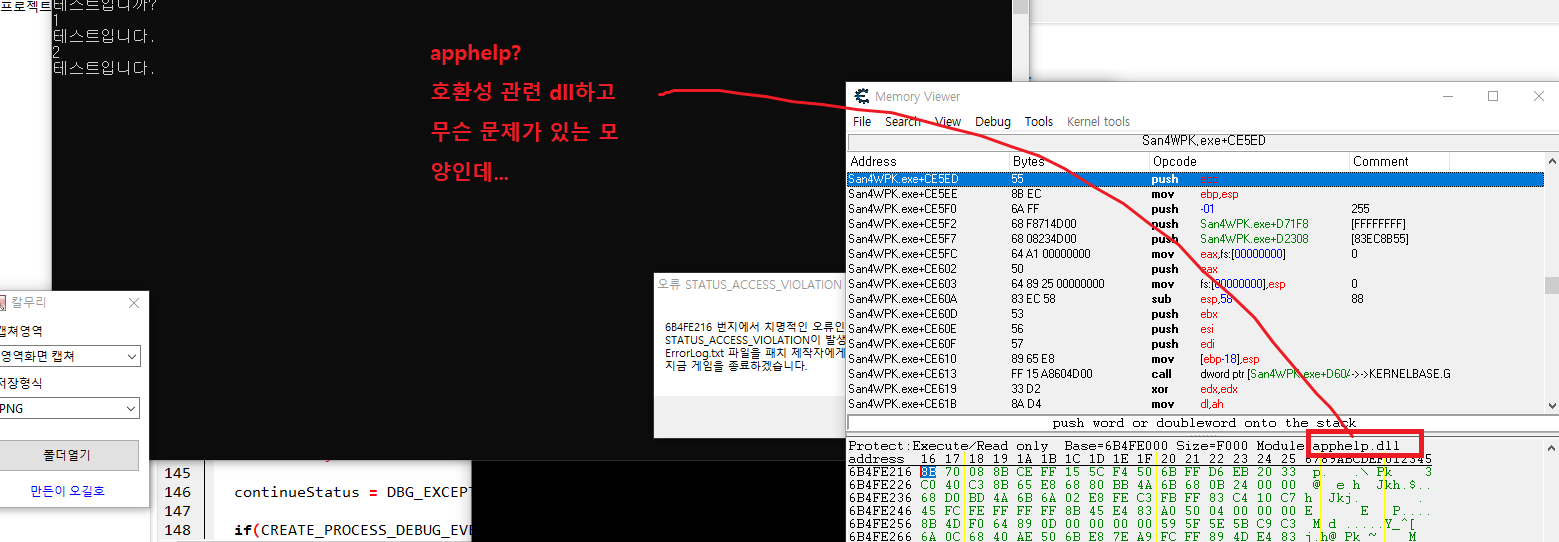 도대체 뭐가 문제여서 그러는 건지, 궁금해서 치트엔진을 키고 해당 주소로 가보았다. 그랬더니 모듈에 apphelp.dll 이라고 쓰여있었다.