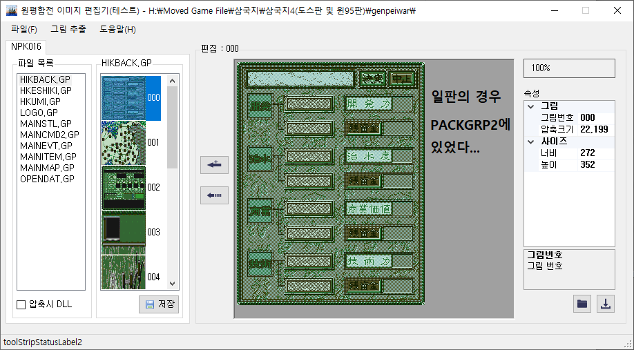 그래서 나는 PACKGRP2.s4 파일을 HIKBACK.GP로 바꾸고 원평합전 폴더에 덮어쓴 뒤, 원평합전 이미지 편집기(링크)에서 그림을 불러오는 방식으로 확인해보았다.