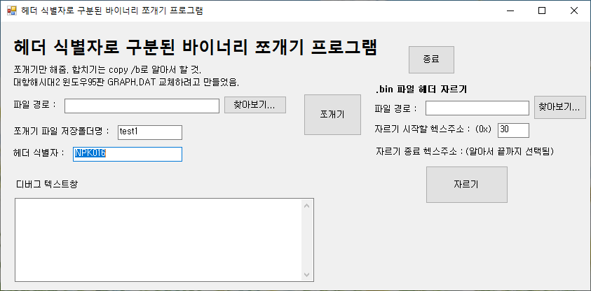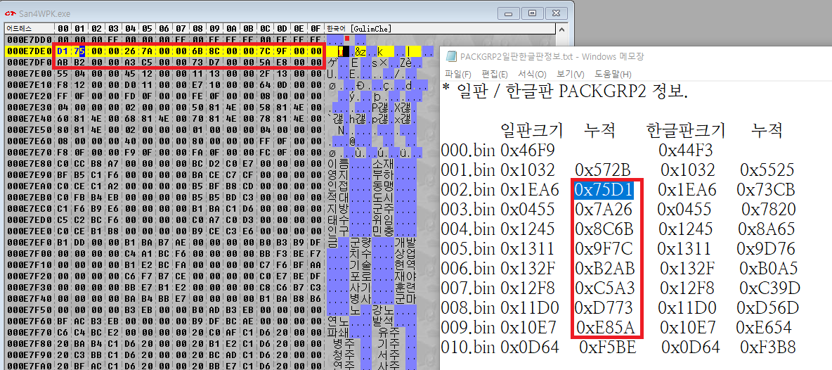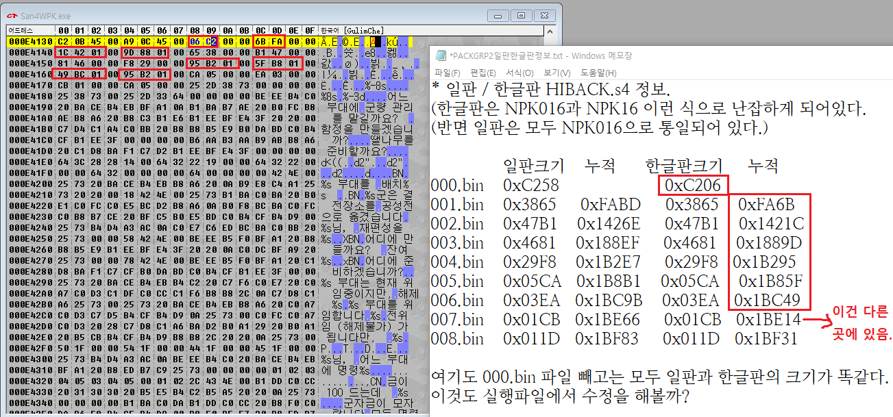 그래서 나는 일단 일판과 정발판의 PACKGRP2.s4 파일을 'NPK016' 헤더를 기준으로 분리해보기로 하였다. 예전에 대항해시대2 엔딩 한글화 하겠다고 삽질한적이 있었는데, 그때 만들어두었던 프로그램을 써보기로 한다. 분리하니까 일판과 정발판 모두 11개의 파일이 나왔다. 11개의 파일을 헥스 에디터로 열어서 파일 끝이 얼마인지를 모두 조사했다.